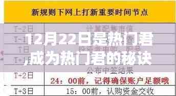 摘要:,,12月22日成为热门君的关键在于掌握进阶技能。要想一步步迈向成功,首先要了解热门趋势,紧跟时代步伐。提升自身专业素养,增强个人魅力。积极互动,扩大社交影响力。通过不断努力和实践,掌握热门君的秘诀,成为引领潮流的佼佼者。